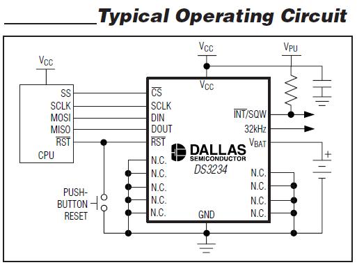 The DS3234SN# is a low-cost, extremely accurate SPI bus real-time clock (RTC) with an integrated temperaturecompensated crystal oscillator (TCXO) and crystal. The DS3234SN# incorporates a precision, temperature-compensated voltage reference and comparator circuit to monitor VCC. When VCC drops below the power-fail voltage (VPF), the device asserts the RST output and also disables read and write access to the part when VCC drops below both VPF and VBAT. The RST pin is monitored as a pushbutton input for generating a reset externally. The DS3234SN# switches to the backup supply input and maintains accurate timekeeping when main power to the device is interrupted. The integration of the crystal resonator enhances the long-term accuracy of the device as well as reduces the piece-part count in a manufacturing line. The DS3234SN# is available in commercial and industrial temperature ranges, and is offered in an industry-standard 300-mil, 20-pin SO package. The applications of the DS3234SN# include Servers, Utility Power Meters, Telematics, GPS.